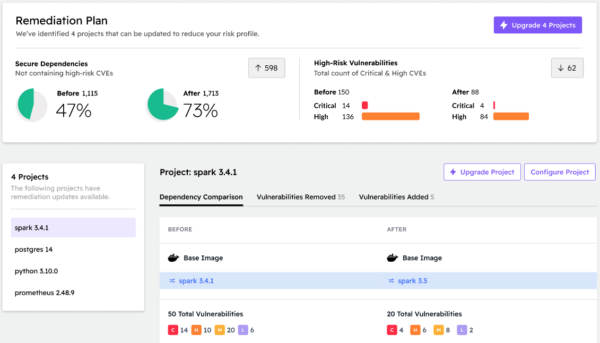 We then create a remediation plan to address the critical and high severity vulnerabilities that have a fixed version available: