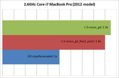 On a modern Intel CPU, you would expect the floating-point version to be as fast, if not better than, the fixed-point version. Indeed, this is true, with the floating point method slightly beating the fixed point one. Image::Scale is still around twice as fast thanks to the lack of libgd overhead and the use of JPEG prescaling.