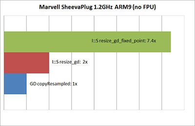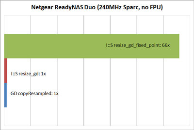 On the non-FPU systems, performance was far better than I expected. The ARM9 clocked in at 7.4x faster than GD, and the Sparc managed to be a whopping 66x faster! On that system, resizing an image now takes half a second where it used to need half a minute.