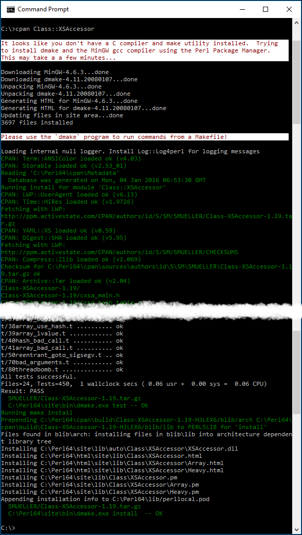 Whether you use our pre-built PPM packages or choose to compile modules yourself, ActivePerl makes installing CPAN modules easier than ever. Thanks to modern open-source tools like MinGW and dmake it makes it easier for Windows developers when it comes to building binary Perl modules.
