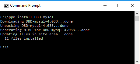 ActiveState maintains repositories of precompiled CPAN packages that can be installed with either the PPM command-line client, or the PPM GUI application. For example, to install the DBD-mysql database driver all you have to do is run the ppm install command: