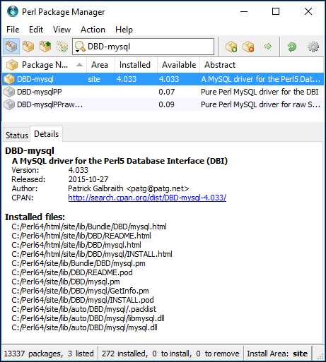 Alternatively you can run ppm without any parameters to invoke the GUI, just search for DBD-mysql, select the DBD-mysql package, and perform the following installation: