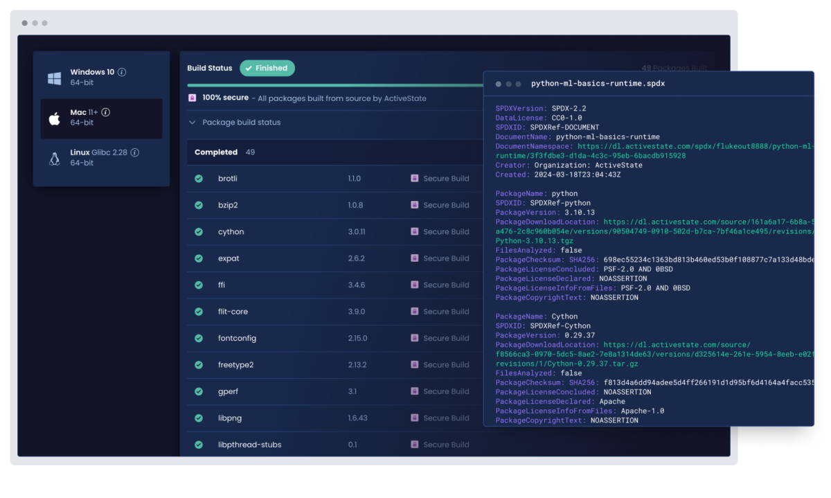 ActiveState provides exhaustive provenance information on all your open source. Generate and manage critical documentation such as Software Bills of Materials (SBOMs) and attestations, making it easier to meet regulatory requirements and build trust with stakeholders.