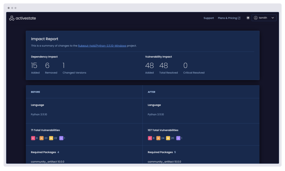 Empower your organization to make decisions quickly with deep insights into your software supply chain. ActiveState helps you understand your risk profile, generate comprehensive reports, and share critical intelligence quickly across your entire team.