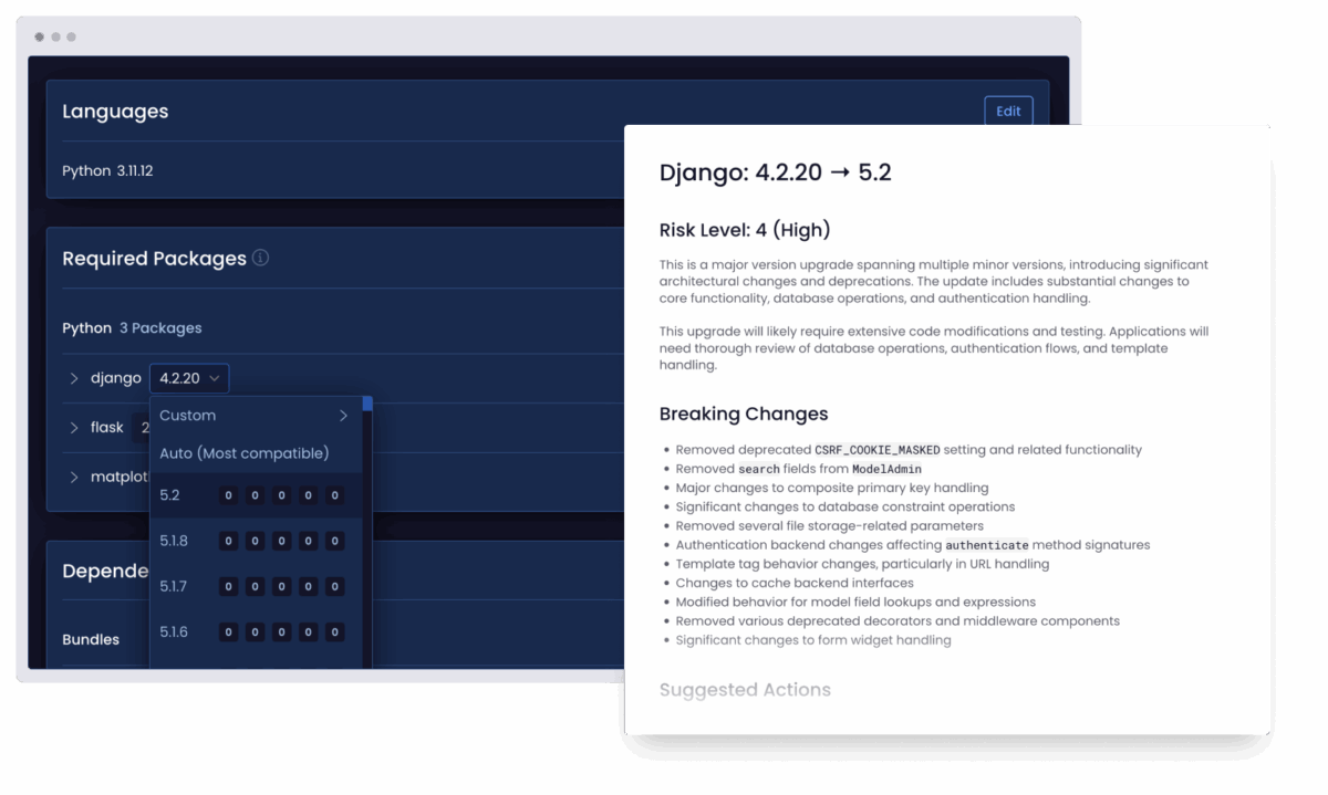 Don’t let security fixes disrupt your workflows. ActiveState analyzes updates in advance, identifying potential breaking changes across your codebase so you can resolve conflicts before they ever reach production.