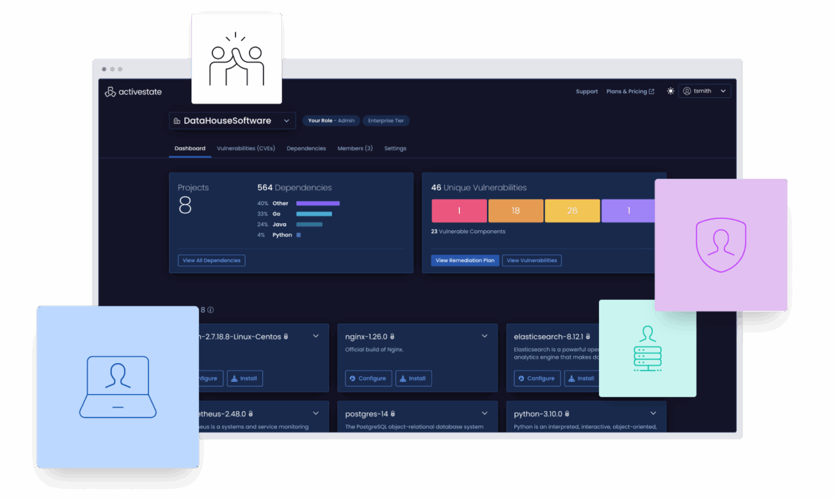 Almost all other open source vulnerability platforms work on a project-by-project basis. The ActiveState platform gives you a true org-wide view of your open source risk, including breaking change analysis and deep impact assessment (down to the C library level).