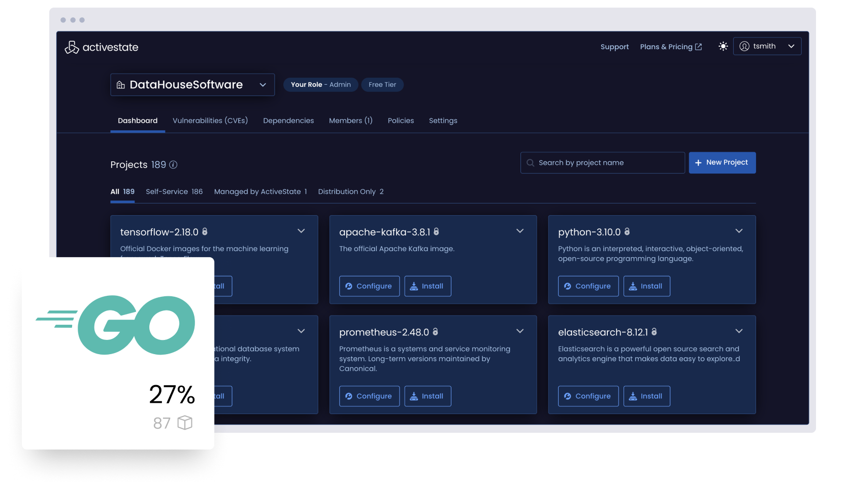 ActiveState makes it safer and easier to manage all your Golang (Go), not just ActiveState Go. You’ll gain a central way to build, deploy, and manage Go while ensuring security, compliance, and consistency between teams, within projects, and across your organization.