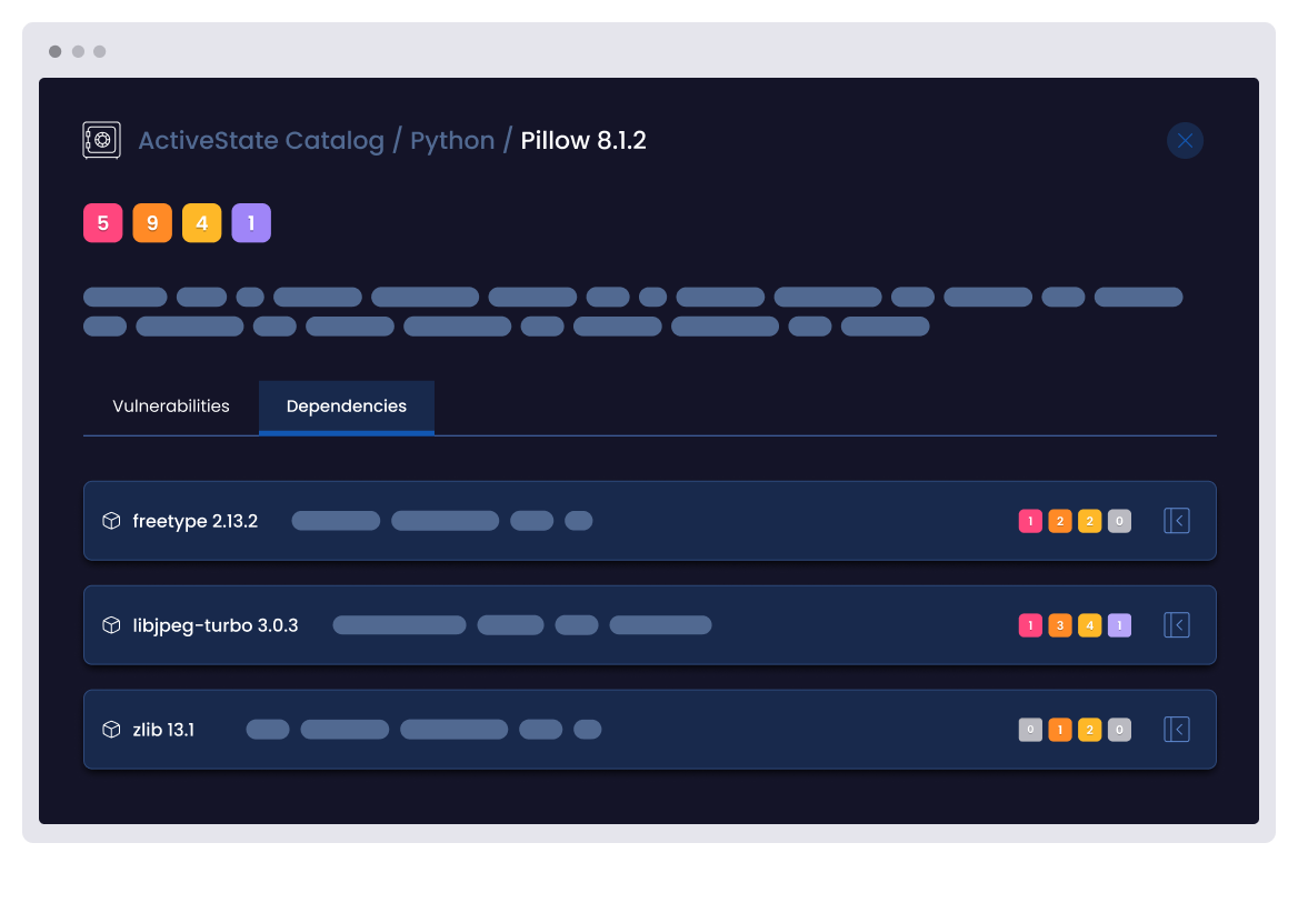 Leverage the world’s most comprehensive open source catalog to uncover transitive dependencies, enforce security policies, and monitor vulnerabilities in real time. ActiveState’s vulnerability blast radius transforms how your organization manages security posture, delivering deep insights that go far beyond basic CVE identification.