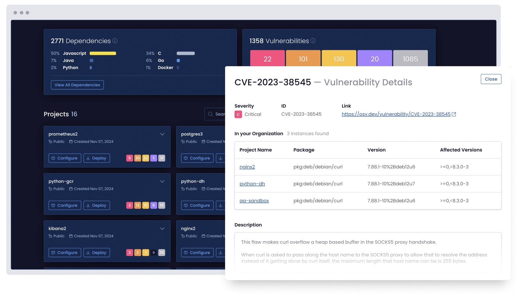 Whether vulnerabilities are lurking in containers, CI/CD pipelines, or developer environments, the ActiveState platform provides a single, integrated view of open source risk, ensuring that security teams, developers, and DevSecOps teams are always aware of their attack surface.