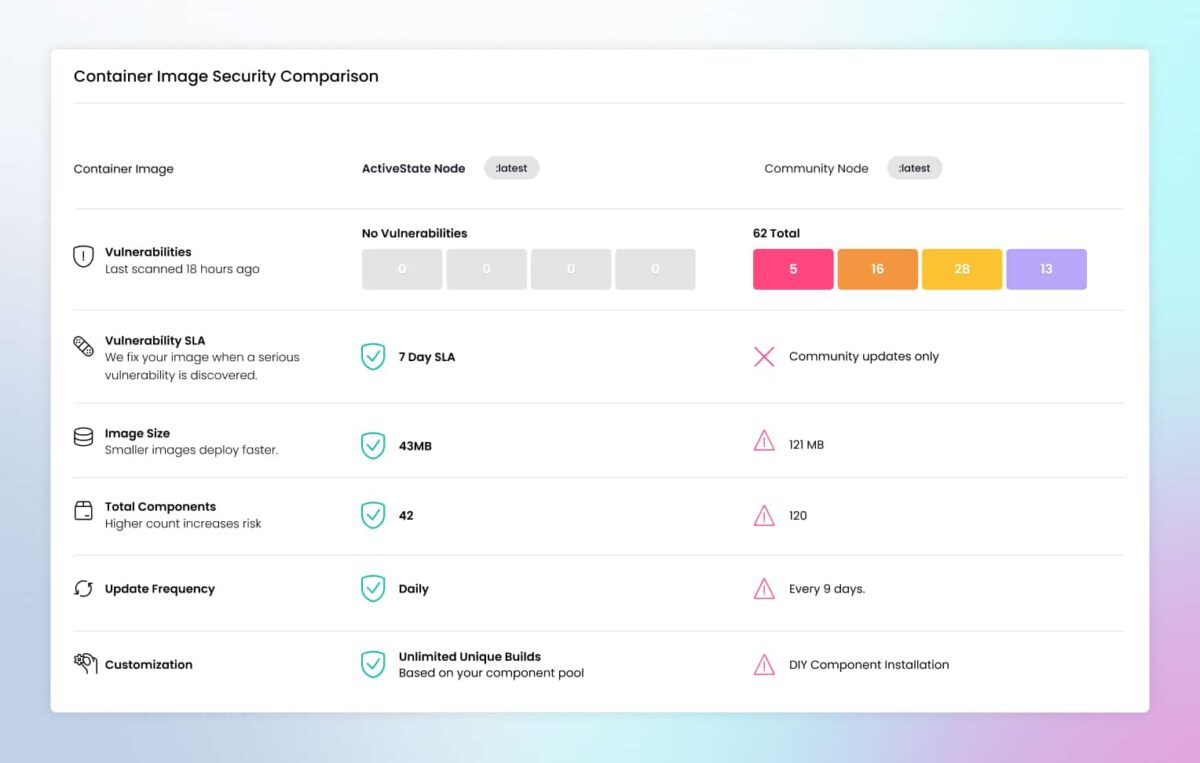 ActiveState maintains industry-leading remediation SLAs of 7 days for critical and high CVEs, and 14 days for all other vulnerabilities. All images are rebuilt nightly and automatically remediated when vulnerabilities are detected.